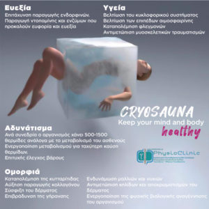 Η Κρυοθεραπεία διεγείρει τις φυσικές ιδιότητες του σώματος για αυτοθεραπεία. Οι ιδιαίτερα χαμηλές θερμοκρασίες έχουν θετικά αποτελέσματα σε 3 επίπεδα: το κυκλοφορικό σύστημα, το νευρικό σύστημα και τους μεσημβρινούς, καθιστώντας την μία εξαιρετική μέθοδο ολιστικής προσέγγισης. Η παραμονή μέσα στην Κρυοσάουνα θεωρείται ασφαλής και ενεργοποιεί όλες τις φυσικές άμυνες του οργανισμού μας. Εφαρμόζοντας ιδιαίτερα χαμηλές θερμοκρασίες (έως και -190 C˚) για μικρό χρονικό διάστημα, μπορούμε να “αφυπνίσουμε” τους μηχανισμούς αυτοθεραπείας του οργανισμού μας, παγώνοντας την εξωτερική στοιβάδα του δέρματος για 1 ως 3 λεπτά, επιτυγχάνουμε την αύξηση του μεταβολικού μας ρυθμού, την ενίσχυση του ανοσοποιητικού μας συστήματος, τη μείωση του άγχους και της κούρασης, με άμεση συνέπεια τη βελτίωση της ποιότητας ζωής.